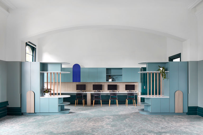"After consultation with the teachers and students, we identified several key directives for the design. One of those, resulting in discussions with the students, was the desire to make the classrooms feel connected to the landscape. Typically, heritage buildings have small openings and apertures allowing limited natural light and can feel disconnected with their external environment. Such was the case with Marlton House. However, we sought to evoke a sense of nature with a palette of green hues, and a custom-designed carpet motive; inspired by leaf debris found in the forest" Excerpt From Christopher Elliot's website on Marlton House.